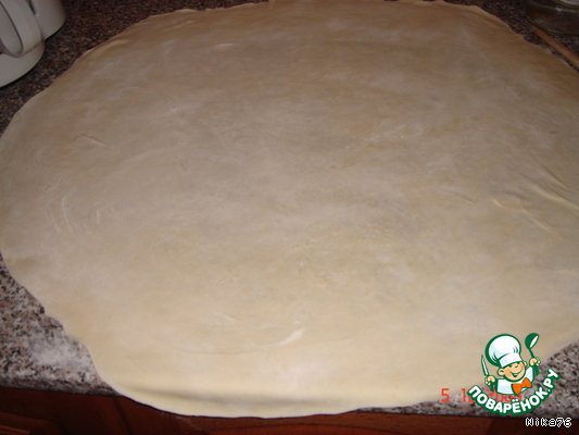 Тонко раскатать тесто. Толщина где-то 1-2 мм.