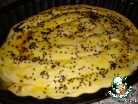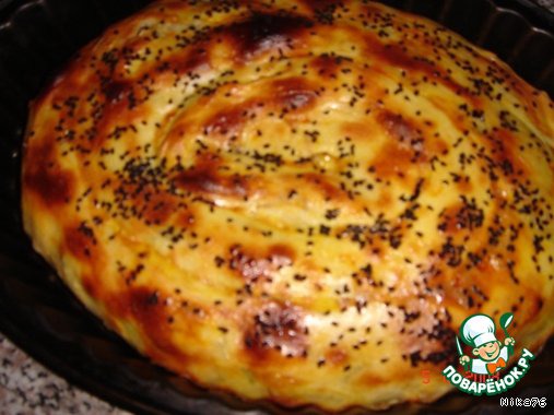 Свернуть рулетом, потом завернуть в форме улитки, слегка вытягивая и придавливая рулетик. Смазать взбитым желтком. Я посыпала такой штукой, которая по-азербайджански называется "чёряк оту", в дословном переводе хлебная трава. По-русски не знаю как. Может кто-то узнает как говорится "в лицо", по фото. Выложить в форму, смазанную маслом и выпекать в духовке.