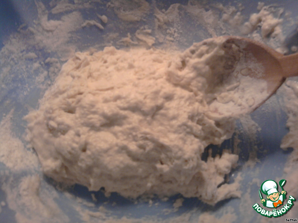 2. Добавляем остатки воды, масло, соль, муку. Размешиваем деревянной ложкой, до тех пор, пока тесто не приобретет форму.