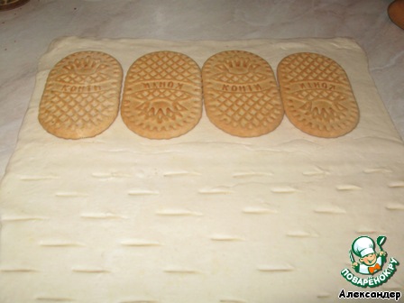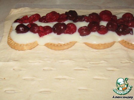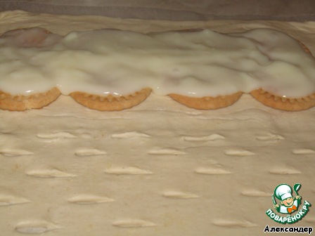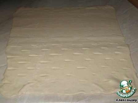 Тесто раскатать (не сильно). Условно (не резать) разделить на две половины. Одну надрезать, как на фото.