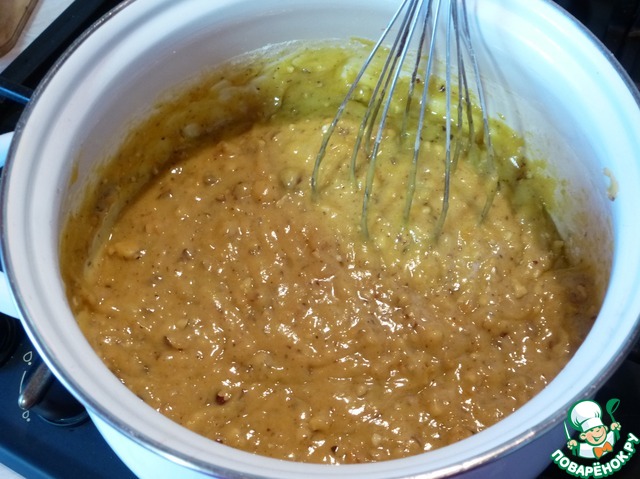 Добавить в полученную массу все наши ароматные специи и немного остудить. Вмешать при помощи венчика в массу яйца по одному.