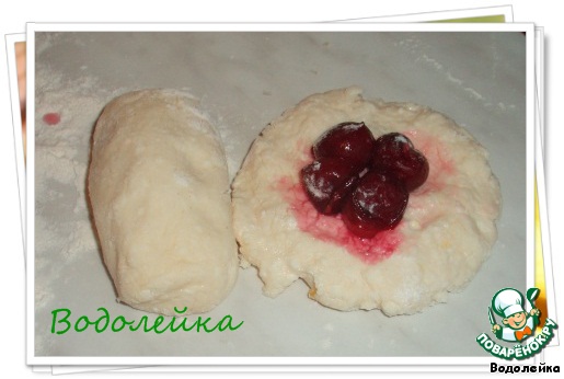 Дальше берем немного творожного теста, формируем из него лепешку и кладем на нее начинку. Тут у меня вишня.