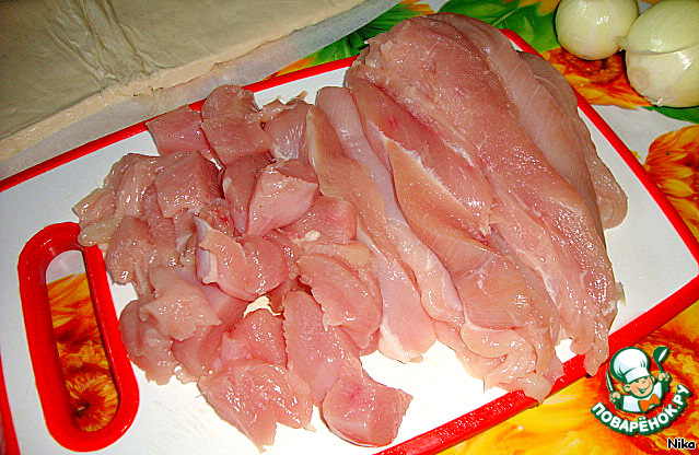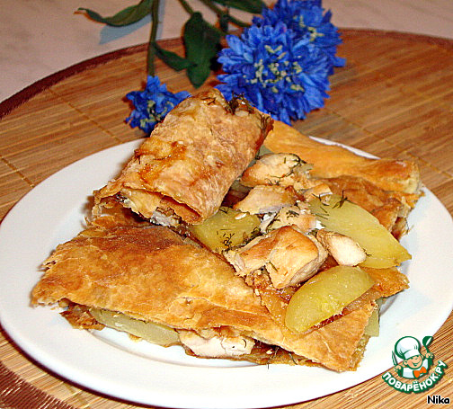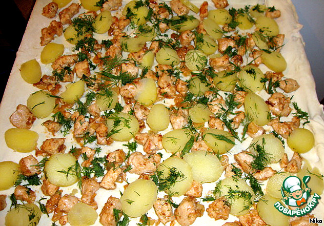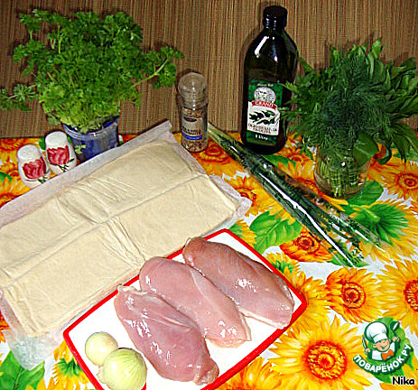 Слоёное тесто, куриное филе, лук, укроп, приправа, перец, соль, масло.