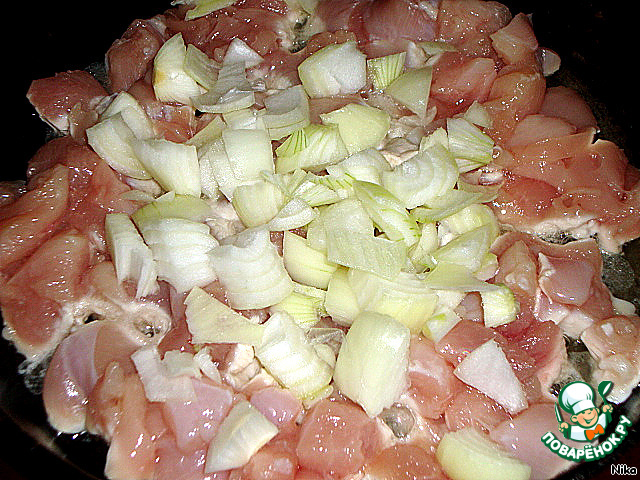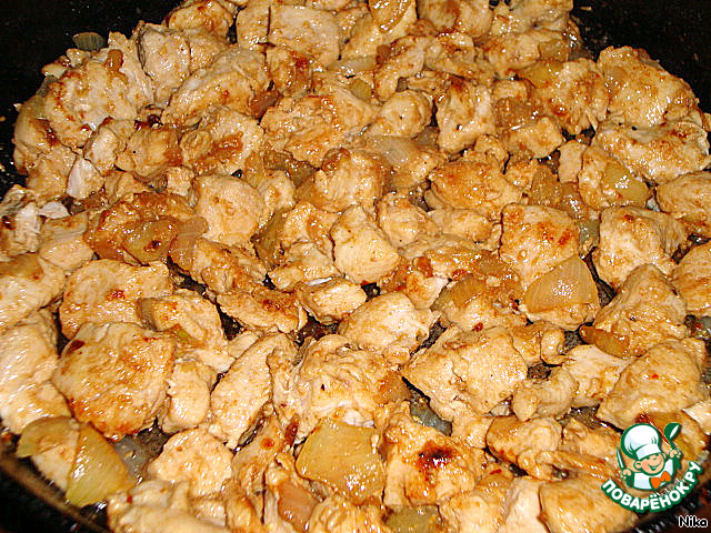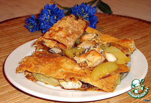 | Рецепт этого блюда был размещeн на сайте в 2008 году пользователем Murchela под аналогичным названием и иллюстрирован мной в рамках акции "Раскраски". Пирог мне и моей семье очень понравился. Особенно сочная начинка и хрустящая корочка. |