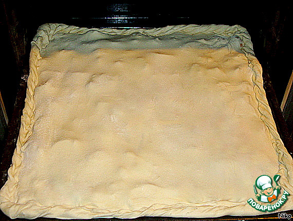 Тесто разделить на две части и тонко раскатать. Осторожно, скалкой перенести на противень.