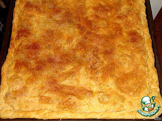 Второй частью раскатанного теста накрыть пирог и защипнуть края. Верх смазать желтком и в нескольких местах проколоть вилкой. Чтобы не подгорел верх пирога, нужно прикрыть пергаментом или фольгой. (Я очень спешила и пирог не смазала, забыла). Поставить противень с пирогом в разогретую духовку на 40 - 45 минут при температуре 180 градусов.