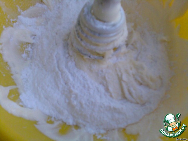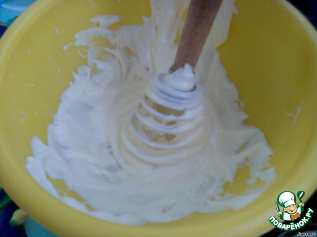Продолжая взбивать, добавить сахарную пудру и ванилин, и прибавлять по ложечке молочный крем. Готовый крем должен хорошо удерживать форму.