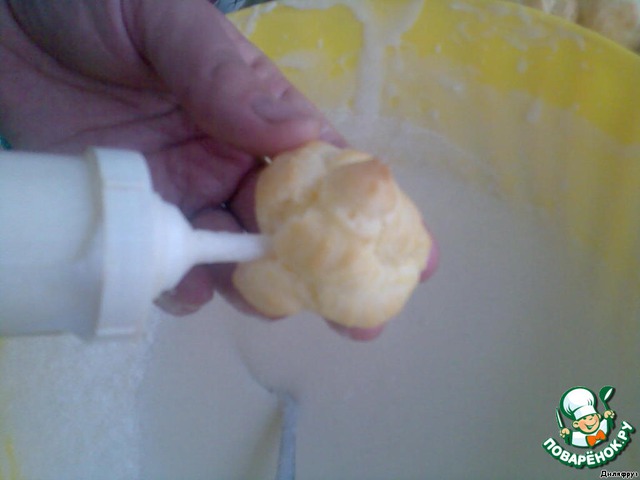 Готовые заварные пирожные наполнить кремом до краев при помощи шприца или конвертика.
