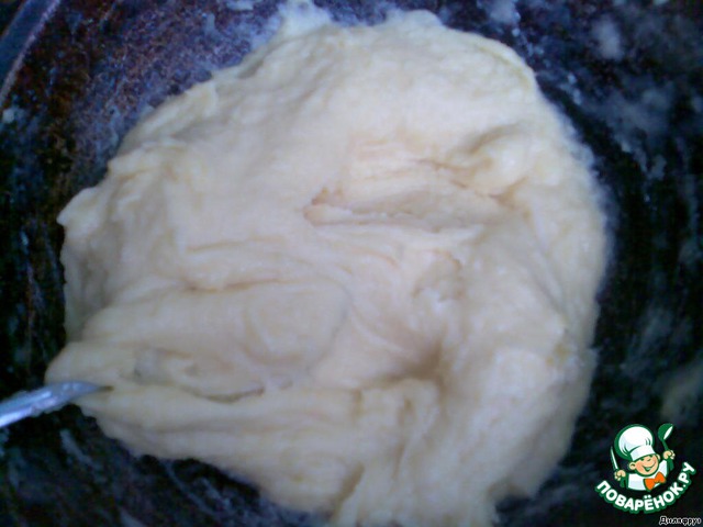 Затем тут же всыпать просеянную муку, непрерывно мешать до тех пор, пока тесто не начнет отходить от стенок посуды, образовав тестяной ком. Горячее тесто снять с огня. Охладить до 60-70 С, далее постепенно, по одному, ввести яйца. После каждого яйца тесто взбивать до гладкости. Температура готового теста должна быть около 40 С, оно должно быть однородным, блестящим и настолько густым, чтобы не расплывалось на противне.