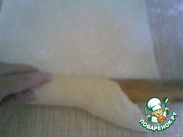Теперь начинаем скатывать пласт по новой накрутив чуть-чуть на скалку, мы вытягиваем тесто приподнимая от стола и накручивая на скалку. Если оно прилипло чуть-чуть к столу, не страшно, приподнимайте, тяните и накручивайте на скалку.