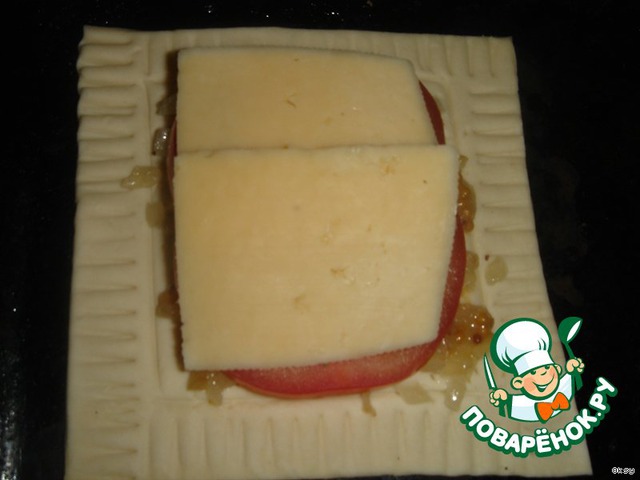 Тесто слегка раскатать и разделить на квадраты, у меня вышло 4 шт.