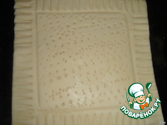 Тупой стороной лезвия ножа вдоль краев провести линию, отступая 1 см. Получаются такие рамочки. Серединку нужно проколоть вилкой. Благодаря таким манипуляциям, тесто внутри начинки поднимется, а внутри нет.