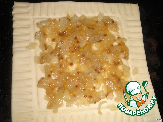 Смешать обжаренный лук и чеснок с двумя видами горчицы и разложить на тесте.