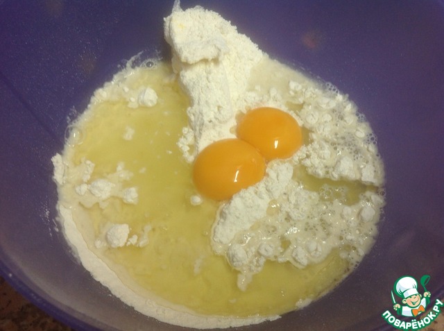 Замесим тесто: мука, стакан воды, 1/2 стакана подсолнечного масла, два желтка, сливочное масло и щепотка соли.