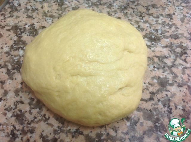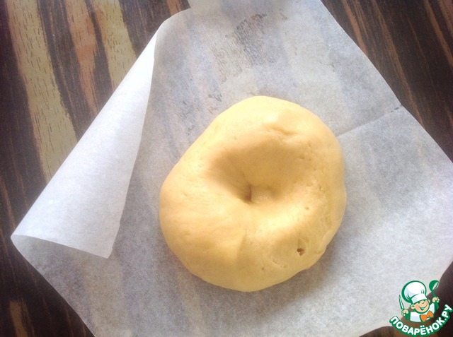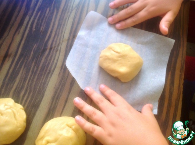 А к тому времени подтянулась тяжелая артиллерия на помощь, мой сынок большой любитель полепить что-нибудь из теста! Итак, большой шарик кладем на кусок пекарской бумаги для более удобной лепки.