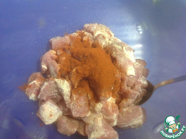 А пока приготовим начинку: мясо нарезать кубиками, посолить, добавить перец и сладкую паприку-перемешать.