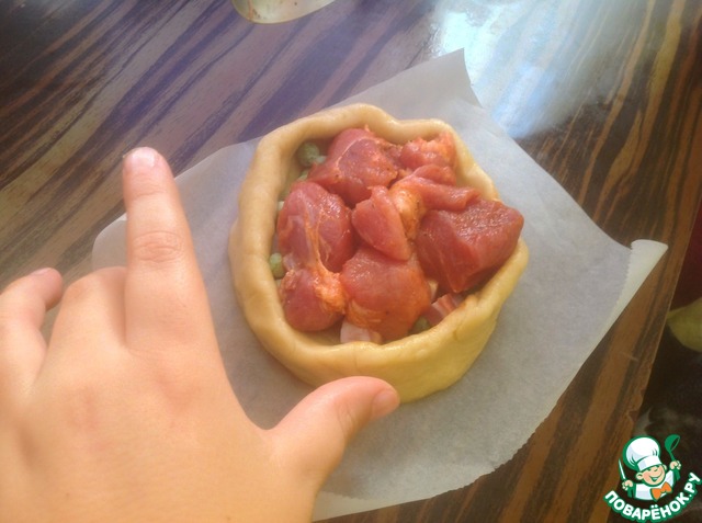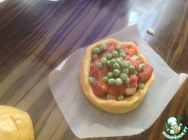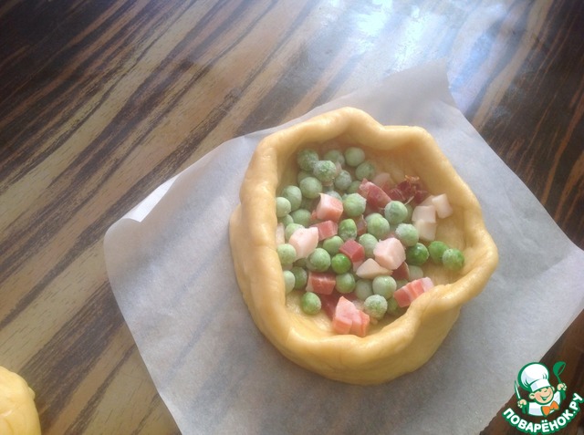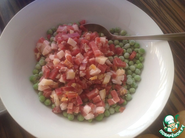 Добавить в зеленый горошек, перемешать. Консервированный горошек не подойдет, так как при выпекании превратится в кашу.
