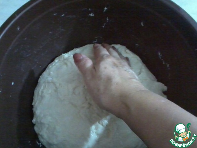 Месить до тех пор, пока тесто не начнет "пыхтеть", минут 5-7. Когда тесто будет замешано, намочите руки водой и ладонью погладьте верхнюю часть:так тесто быстрее подойдет.