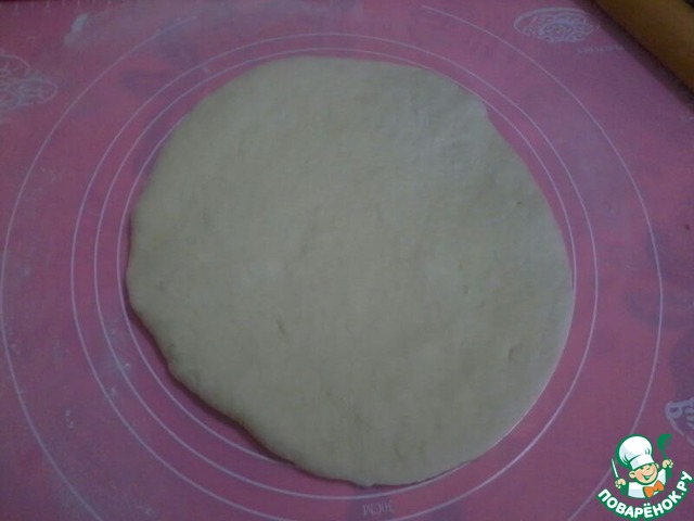 Слегка припылите стол мукой и раскатайте колобок, толщина теста должна быть около7-8 мм.