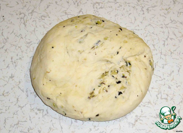 Замесила тесто из 25 г свежих дрожжей, 1 стакана теплой воды, 1 ст.л. оливкового масла, 1 ч. л. соли, 1 яйца, и около 400г муки.