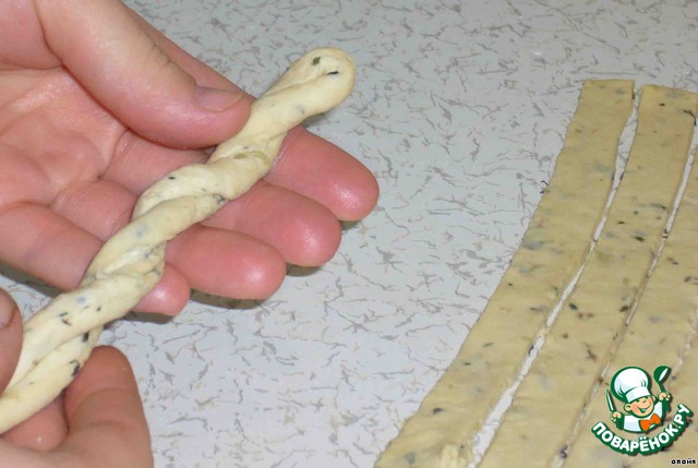 Кусочки раскатала в длинные колбаски, где-то с карандаш толщиной, потом свернула пополам и закрутила.