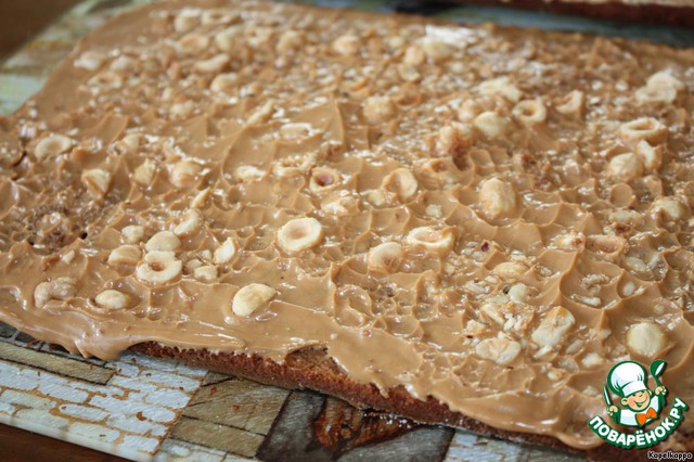 Для крема взбить сметану с оставшейся сгущенкой.Промазать корж,посыпать орешками,накрыть вторым коржем