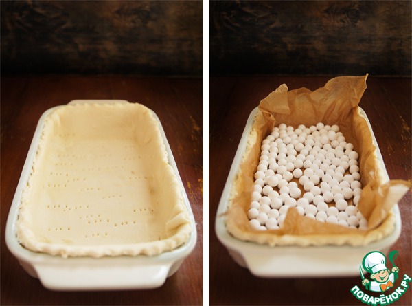 Тесто раскатать, перенести в форму (у меня 20х11 см), обровнять края, дно наколоть вилкой.