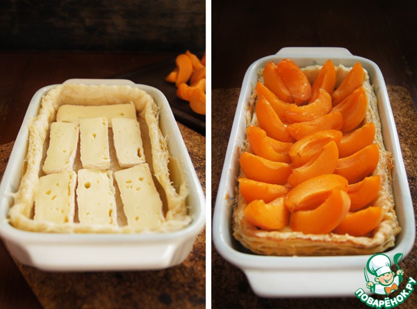 Когда сыр начнёт плавиться (минут через 10), вынуть форму, распределить поверх сыра абрикосы и снова поставить в духовку, минут на 12-15.