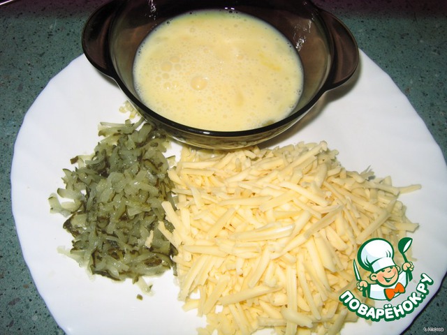 Сыр и огурчик трем на терке, чеснок пропускаем через давилку, яйца слегка взбиваем.