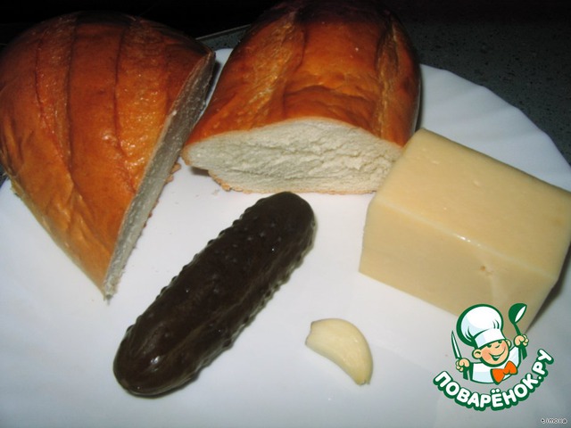 Подготавливаем хлеб, огурчик, зубчик чеснока и сыр.