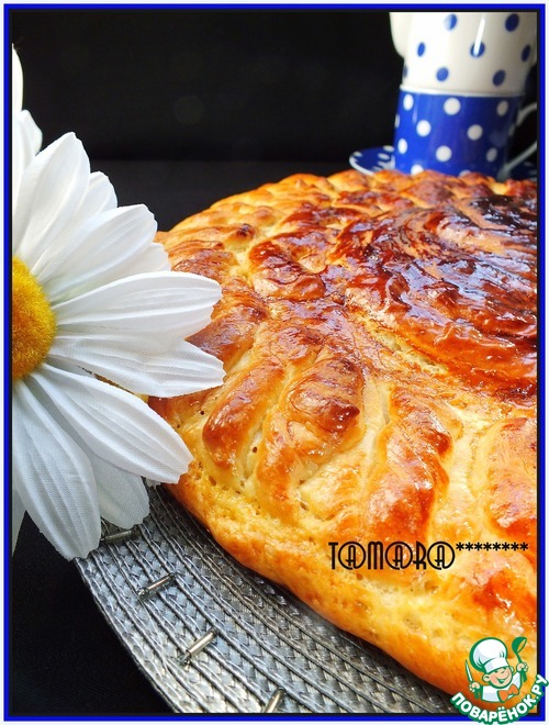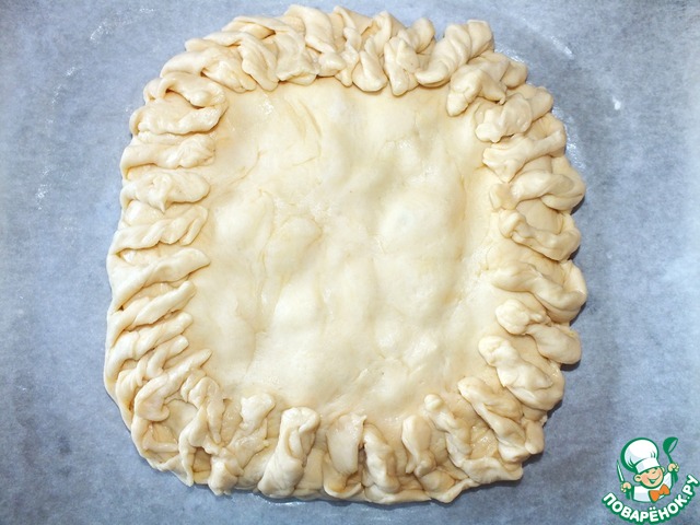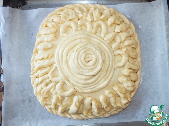 Оставшееся тесто раскатать в жгутики, сделать каемку пирогу и сверху украсить спиралькой из жгутиков. Поставить пирог на расстойку минут на 20, затем смазать яичным желтком. Выпекать при t-180* минут 20-25. По готовности накрыть пирог полотенцем и дать "отдохнуть" с полчасика.