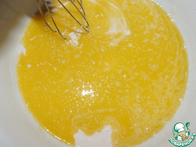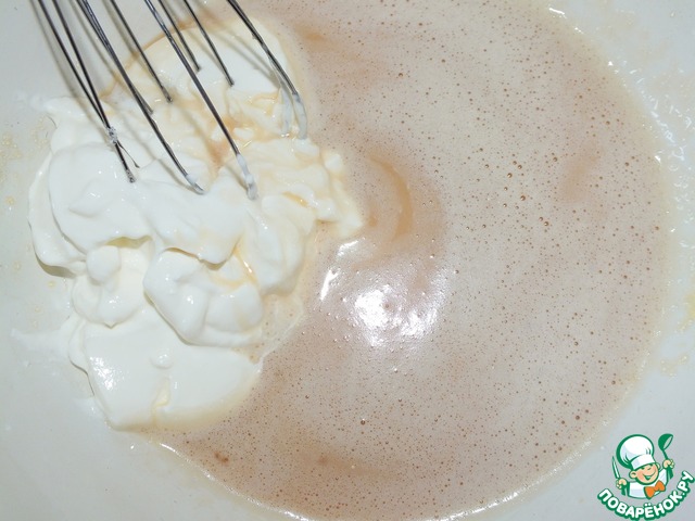 В теплом молоке развести дрожжи, влить в яичную смесь, добавить сметану, размешать