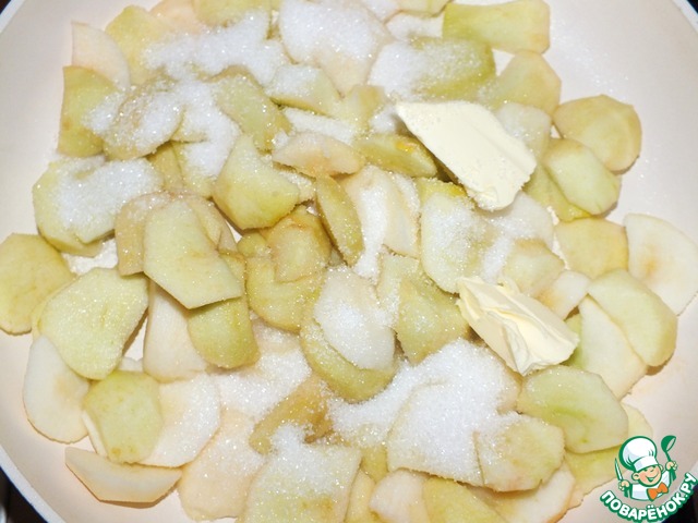 Тем временем сделать начинку из яблок. Яблоки помыть, очистить от кожуры, нарезать на дольки. В сковороде смешать яблочные дольки, сахар и сливочное масло. Потушить минут 7-10 на среднем огне