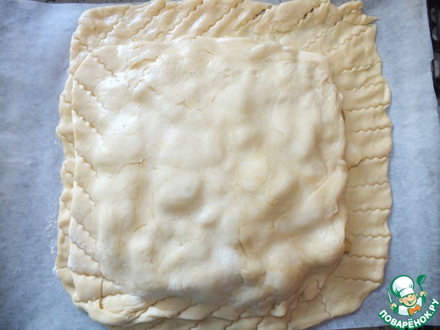 Сверху накрыть вторым раскатанным пластом. У меня получилось немного кривовато. Края пирога разрезать на полоски