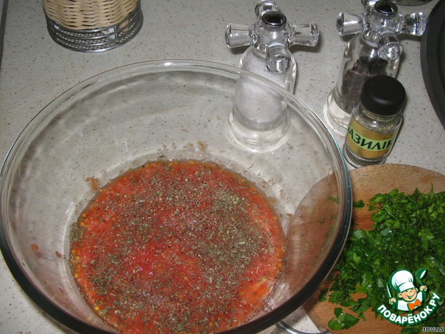 Петрушку моем, мелко режем и добавляем в помидорное пюре. Туда же кладем базилик (у меня сухой), соль и перец.