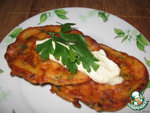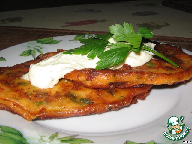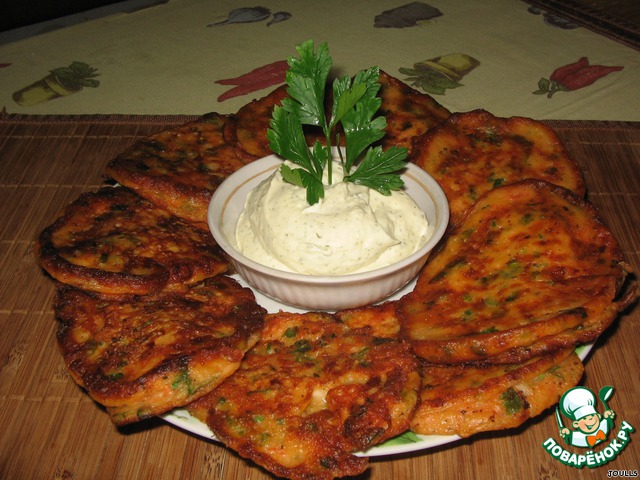 Я делала к оладьям соус: 2 ст.л. сметаны, 2 ст.л. майонеза, зубок чеснока + сухой укроп (а еще лучше свежий, но у меня такового не нашлось).