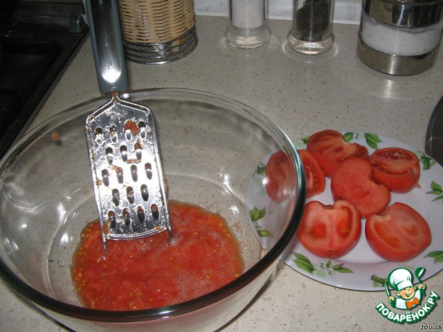 Помидорки моем и разрезаем пополам. Берем терку и натираем наши половинки, при этом шкурка остается у нас в руках. Она нам не нужна, выбрасываем. Можно, конечно, предварительно очистить помидорки от шкурки, но мне было просто лень.