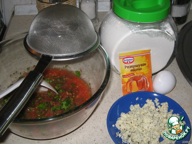 Затем добавляем яйцо, размятую фету (у меня рассольная брынза с базиликом), муку и разрыхлитель.