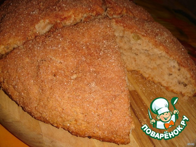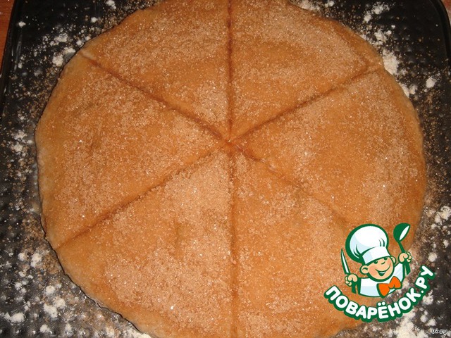 Сделайте на лепешке 6 надрезов, смажьте при помощи кисточки молоком и присыпьте смесью сахара и корицы ( 2 ст.л. сахара+1/4 ч.л.корицы).