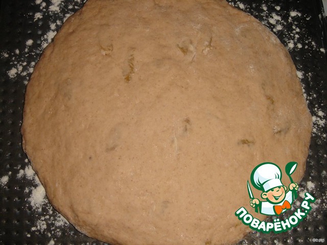 На смазанном маслом и присыпанном мукой противне раскатайте руками тесто в лепешку диаметром 18-20 см, толщиной 2 см. Края должны быть более тонкими.
