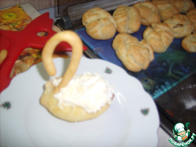 Сделаем заварное тесто (1 стакан воды, 100 гр маргарина, когда закипит высыпать 1 стакан муки, постоянно помешивая, заварить тесто, когда остынет, добавить по одному 4-5 яиц), из такого кол-ва получается 15 лебедей и ещё 4-5 сладких пирожных.