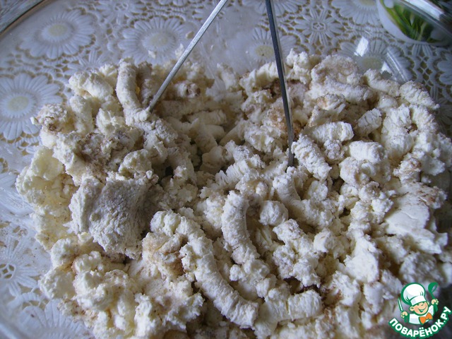 Хорошо размешать творог с сахаром, солью, ванилином и корицей. Не делайте это блендером, получится паста творожная.