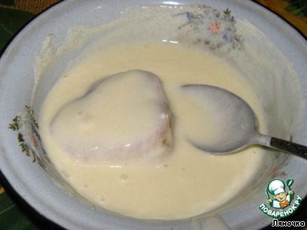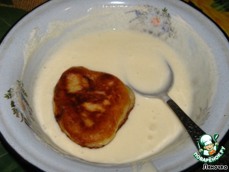 Горячий оладушек прямо со сковороды кидаем в чашку с заливкой.