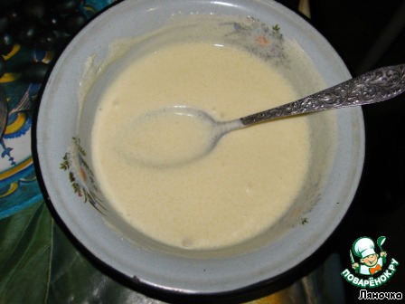 Берем подходящую емкость, куда мы будем складывать наши оладьи, кладем небольшой слой заливки, столько, чтобы она чуть закрывала дно.