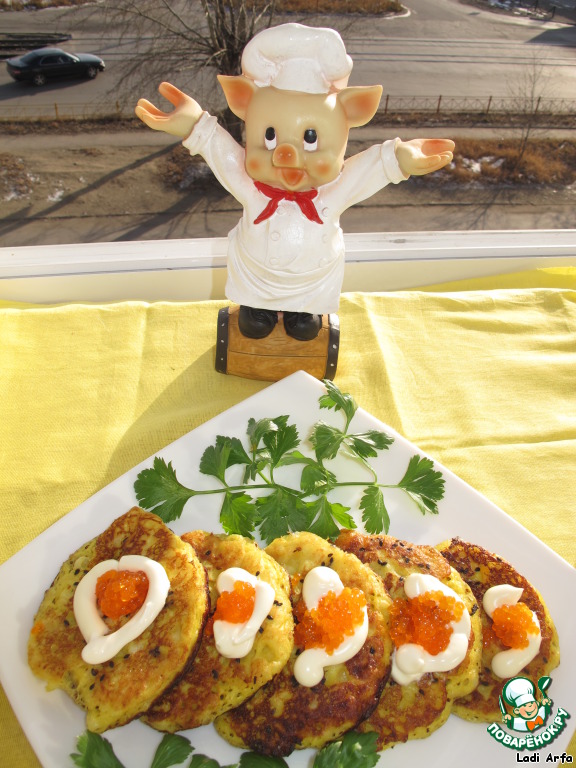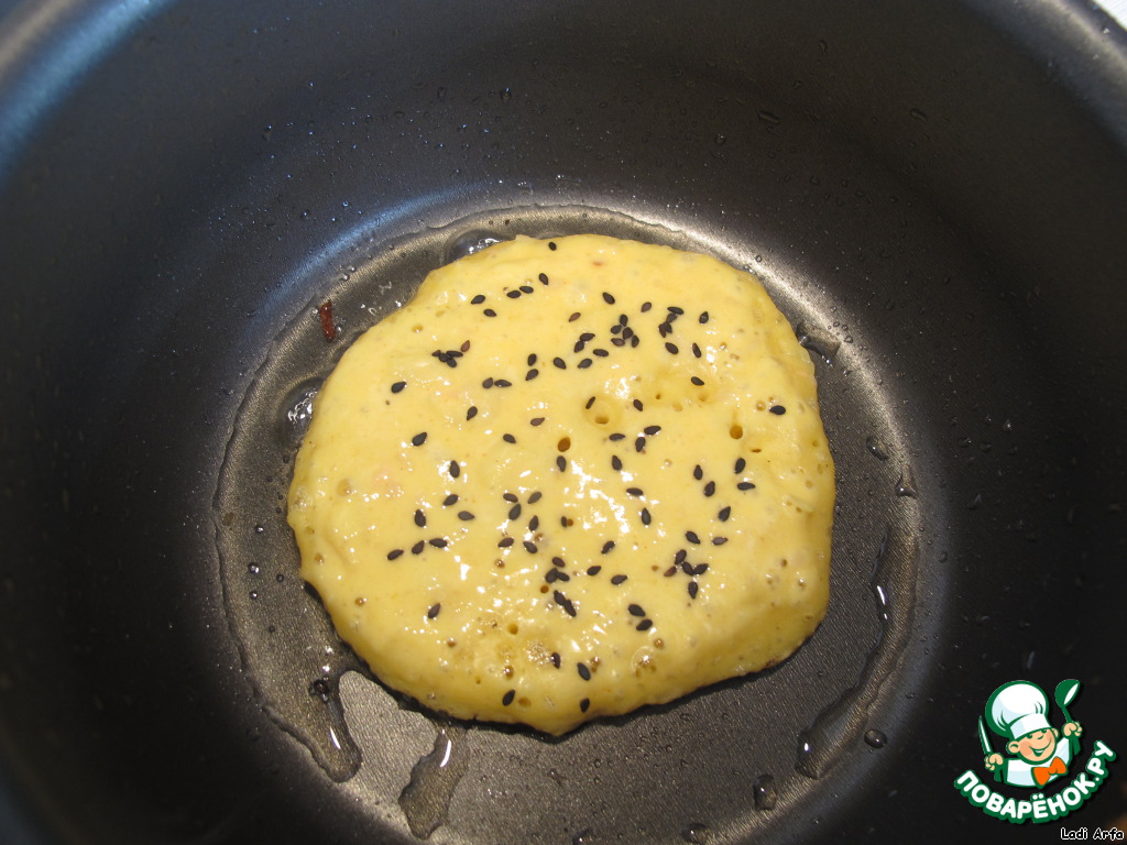 Посыпав каждую оладушку чёрным кунжутом, подавали оладьи с мёдом и вареньем, с икрой и сметаной.