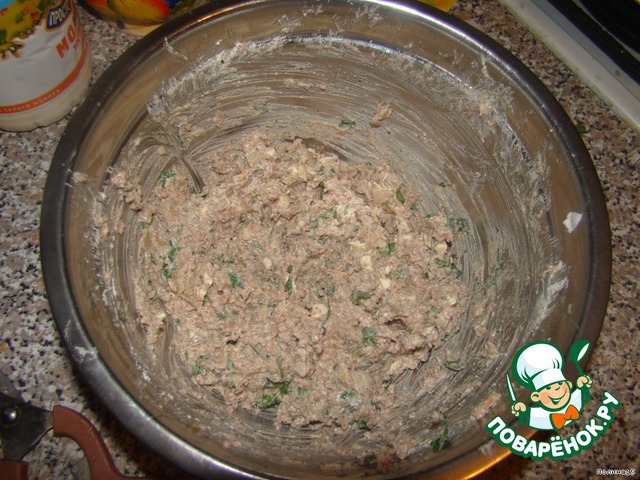 Даем фаршу остыть и смешиваем его с рубленной петрушкой,фетой и мелко резаной брынзой.Добавляем черный молотый перец(побольше;)