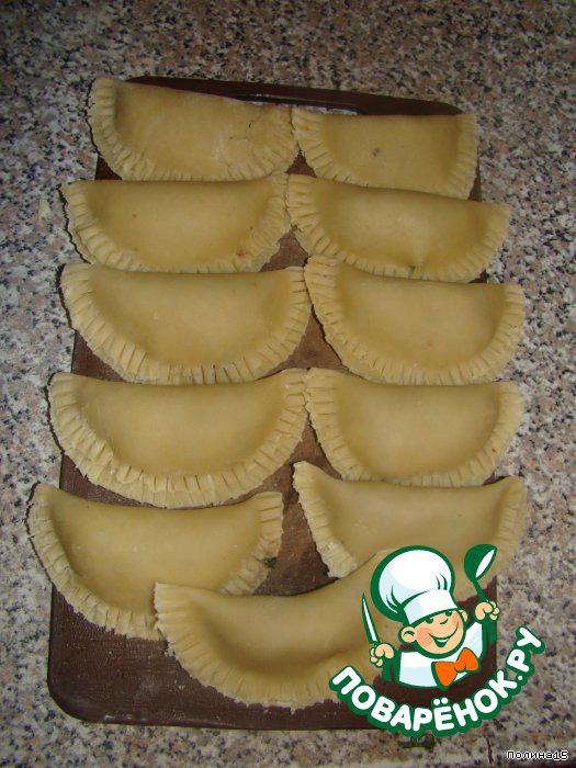 Тонко катаем тесто и режем из них кружочки диаметром 12см.,выкладываем в них начинку и аккуратно слепливаем,после чего вилкой прижимаем по краям,выкладываем самбусики на пергамент и сбрысгиваем маслом,в разогретой духовке выпекаем 20 мин.ПРИЯТНОГО АППЕТИТА!