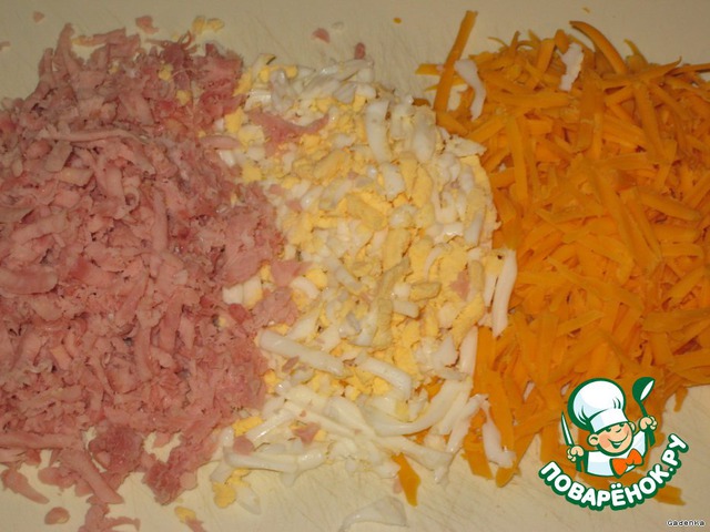 Для начинки ветчину, сыр и вареное яйцо натереть на крупной терке, добавить паприку, по желанию болгарский перец, горошек или кукурузу.