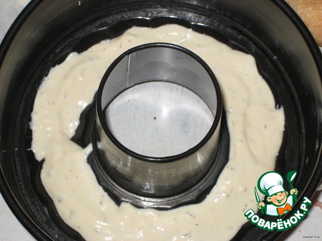Я взяла форму в виде кекса с дыркой внутри, но можно и обычную круглую, выкладывая трубочки с блинами по спирали.