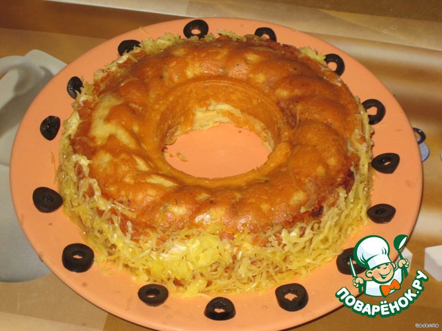 Если делать в обычной круглой форме в один слой, то налить тесто немного на дно, выложить трубочки, закручивая по спирали, также не плотно, прижимая друг к другу, залить всей сырной массой и выпекать.